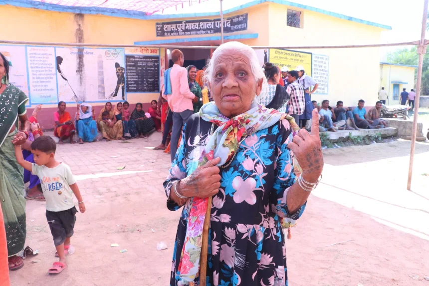 Kanker. कांकेर। त्रिस्तरीय पंचायत आम निर्वाचन 2025 के तहत जिले की जनपद पंचायत कांकेर, नरहरपुर और चारामा में अपनी स्थानीय सरकार का चुनाव करने ग्रामीण मतदाताओं में गजब का उत्साह दिखा। युवा वर्ग ही नहीं, बड़े बुजुर्ग, निशक्तजन और महिला मतदाताओं में भी मतदान करने पोलिंग बूथों में लंबी कतारें सुबह से ही देखने को मिली। कहीं पर महिलाएं अपने बच्चे को गोद में लिए, तो कहीं उम्रदराज मतदाताओं को सहारा देकर मतदान केंद्रों में लाते नजर आए। इसी क्रम में आज कांकेर विकासखण्ड के ग्राम पटौद के मतदान केन्द्र में लगभग 90 वर्षीय फुलोबाई पटेल ने भी अपने मताधिकार का प्रयोग किया। उन्होंने उत्साह के साथ मतदान करते हुए कहा कि मतदान हमारा अधिकार है, सबको अपना स्थानीय जनप्रतिनिधि चुनने