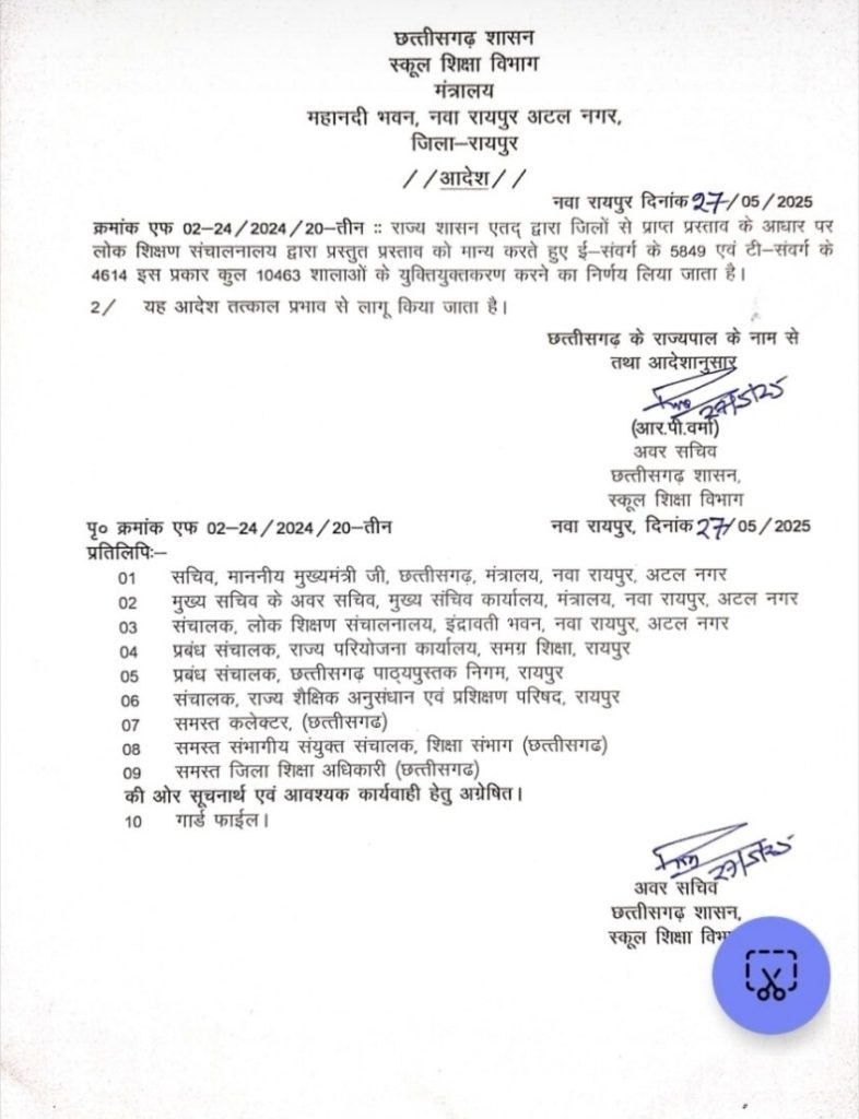 छत्तीसगढ़ में युक्ति युक्त करण की प्रक्रिया तेज हो गई है प्रथम चरण में स्कूलों का युक्तियुक्त करण किया जा रहा है इस संदर्भ में स्कूल शिक्षा विभाग की तरफ से आदेश जारी कर दिया गया है तय समय सारणी के मुताबिक स्कूलों के युक्तियुक्तकरण की प्रक्रिया चल रही है।