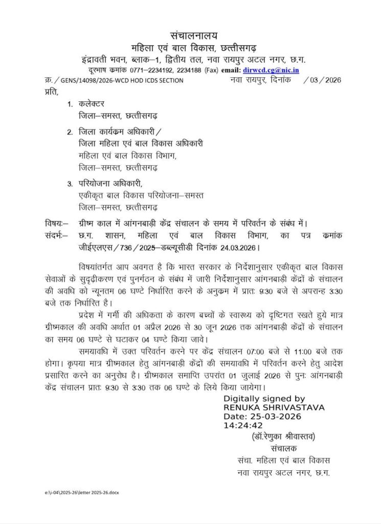 नए आदेश के अनुसार अब आंगनबाड़ी केंद्र सुबह 7 बजे से 11 बजे तक ही संचालित होंगे। पहले केंद्र करीब 6 घंटे तक चलते थे, लेकिन अब समय घटाकर 4 घंटे कर दिया गया है ताकि छोटे बच्चों को तेज धूप और लू से बचाया जा सके। सरकार ने अभिभावकों से अपील की है कि बच्चों को बिना जरूरत घर से बाहर न भेजें, पर्याप्त पानी पिलाएं और ठंडी जगह पर रखें। गर्मी को देखते हुए प्रशासन लगातार हालात पर नजर बनाए हुए है।