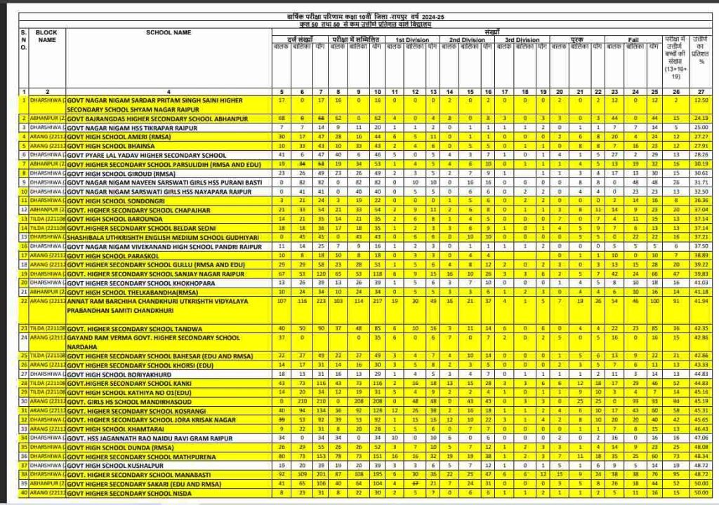 रायपुर। CG News:छत्तीसगढ़ में कक्षा 10वीं और 12वीं के परीक्षा परिणामों में खराब प्रदर्शन करने वाले स्कूलों की अब गहन जांच और उनके शिक्षकों पर कार्रवाई की तैयारी शुरू हो चुकी है। जिले में 40 ऐसे स्कूल चिन्हित किए गए हैं जिनका परीक्षा परिणाम 50 प्रतिशत से भी कम रहा है।