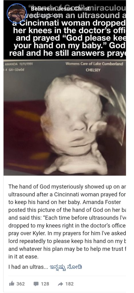 महिला ने लिखा,’हमने और कई अन्य लोगों ने मिलकर बहुत दुआ की. जब हमने एक स्पेशलिस्ट से दोबारा जांच करवाई तो बीमारी पूरी तरह से गायब थी.’ अमांडा का कहना है कि उन्होंने अपने बेटे की अल्ट्रासाउंड रिपोर्ट में एक हाथ देखा जो बच्चे के सिर को सहला रहा था. उनकी छोटी बेटी ने सबसे पहले पूछा,’ये हाथ किसका है?’ इसके बाद उनके पति ने भी देखा और कहा कि यह भगवान का हाथ हो सकता है जो उनके बेटे की रक्षा कर रहा है.’