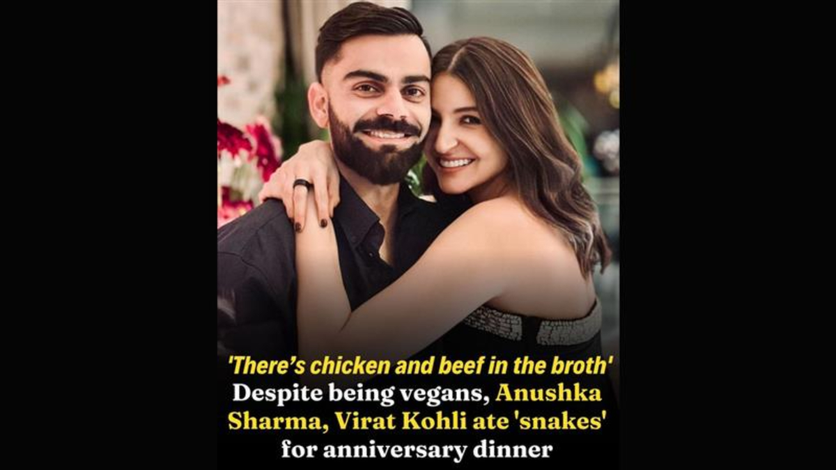 Anushka Sharma, Virat Kohli Ate Snakes? विराट कोहली और अनुष्का शर्मा दुनिया के सबसे लोकप्रिय सेलिब्रिटी कपल्स में से एक हैं और दोनों ही सख्ती से शाकाहारी आहार का पालन करते हैं. 2022 में दोनों ने प्लांट-बेस्ड मीट ब्रांड ‘ब्लू ट्राइब’ में निवेश भी किया था और विराट कई बार अपने शाकाहारी जीवनशैली के बारे में सार्वजनिक रूप से बात कर चुके हैं. लेकिन हाल ही में सोशल मीडिया पर एक दावा वायरल हो रहा है जिसमें कहा गया कि अपनी शादी की सालगिरह डिनर के दौरान विराट और अनुष्का ने ‘सांप’ खाए और उनके खाने में चिकन व बीफ का इस्तेमाल हुआ। यह दावा तेजी से फैलने लगा और कई लोगों को भ्रमित कर गया.