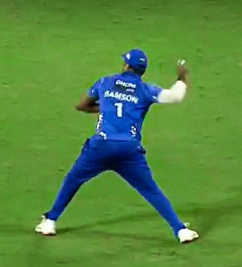 संजू सैमसन की जर्सी पर लिखा है धोनी ऐप
